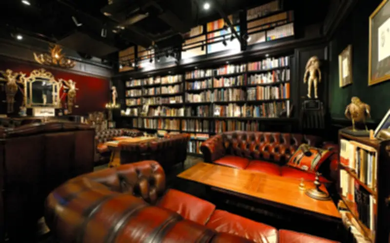 重厚な扉をゆっくりと開けると、そこには妖しい光に包まれた空間が広がっていた。照明を落とした室内では、赤い革のビンテージソファが柔らかな輝きを放ち、金の調度品や人形が壁一面に並ぶ本と共に、独特の雰囲気を醸し出している。この場所は、東京・中央区銀座5丁目にある地下の秘密のバー「Book Café&Bar 十誡」である。