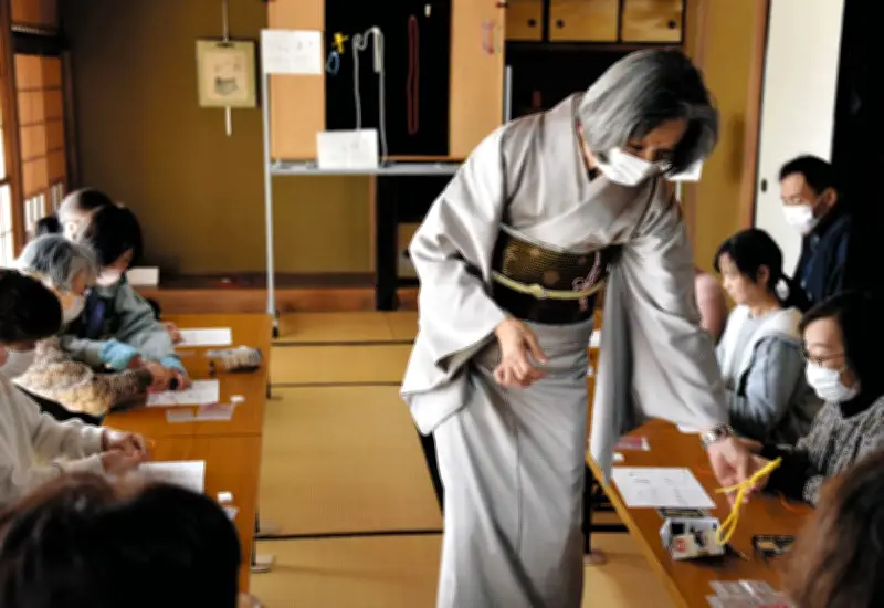 講座では、花結びを長年研究してきた堀口敬子さんが講師を務め、参加者一人ひとりに丁寧に指導している。2月に開催された第29回講座では、参加者たちが長さ約1メートルのひもを巧みに編み込み、根付け作りに挑戦した。