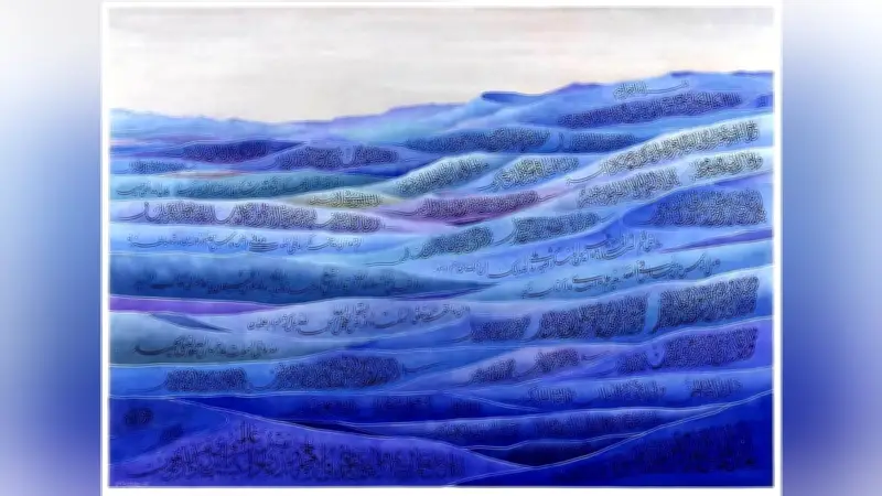 本田さんの作品の中でも特に注目を集めているのが、「青の砂漠」と「赤の砂漠」です。「青の砂漠」は、幾重にも重なる風紋が計り知れない自然の奥深さを感じさせ、観る者に静かな感動を与えます。一方、「赤の砂漠」は「青の砂漠」と対をなす作品で、色彩の対比を通じて砂漠の多様な表情を表現しています。これらの作品は、アラビア書道の文字が単なる記号ではなく、神々しさや自然の神秘を宿す芸術であることを示しています。