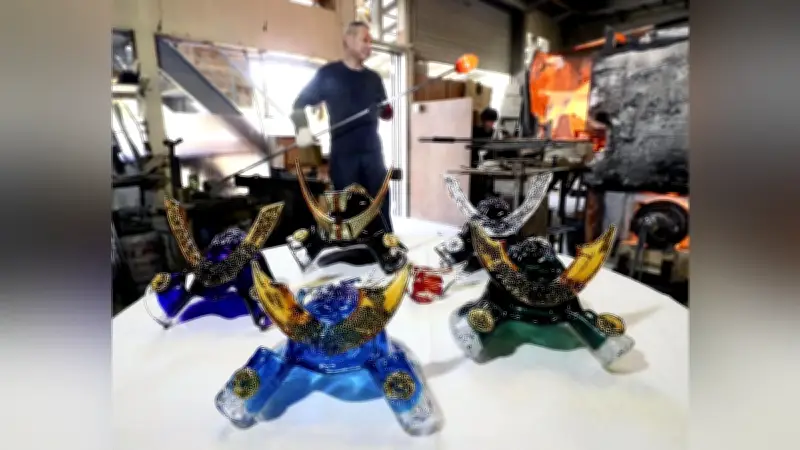 5月の端午の節句を控え、福岡県宗像市のガラス工芸品製造・販売会社「粋工房」において、ガラスの兜作りが最盛期を迎えています。溶鉱炉を備えた工房内では、熟練の職人たちが高温と向き合いながら、一つひとつの作品に情熱を注いでいます。