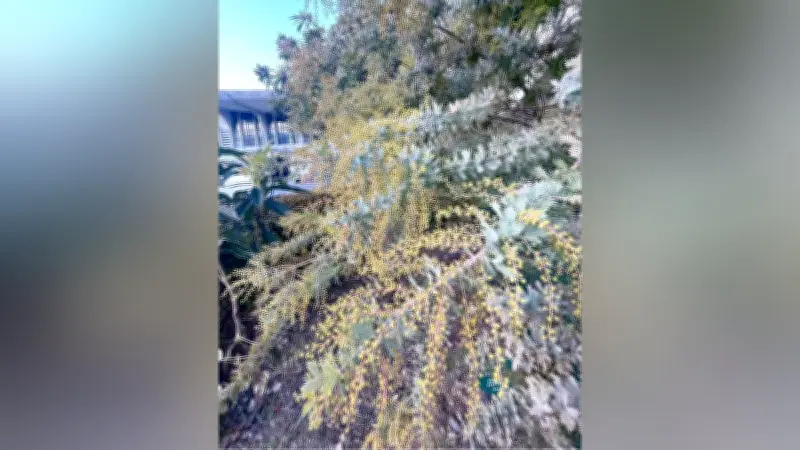 諫早市でミモザのつぼみが膨らみ、春の訪れを告げる