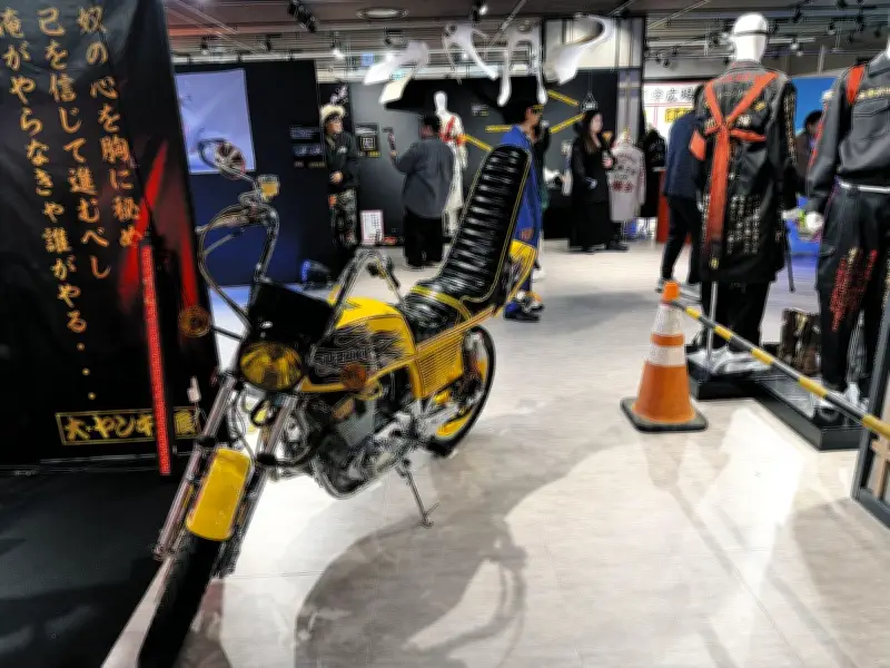 会場には、ヤンキーが実際に着用していた学生服や特攻服、改造バイクなど、300点以上のアイテムが展示されています。特に学生服のコーナーでは、丈の長い「中ラン」と幅の太いズボン「ボンタン」、あるいは丈の短い「短ラン」と裾をファスナーにしたボンタンの組み合わせなど、当時の特徴的なスタイルが再現されています。試着用の学ランも用意されており、来場者が実際に着用して記念写真を撮ることも可能です。