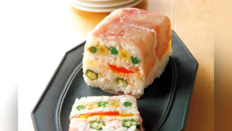 春の訪れを感じさせる鮮やかな食材を使った、テリーヌ形の押しずしのレシピをご紹介します。この料理は、型に敷き詰めて成形する押しずしの一種で、見た目も美しく、パーティーや特別な日の食卓を彩るのにぴったりです。