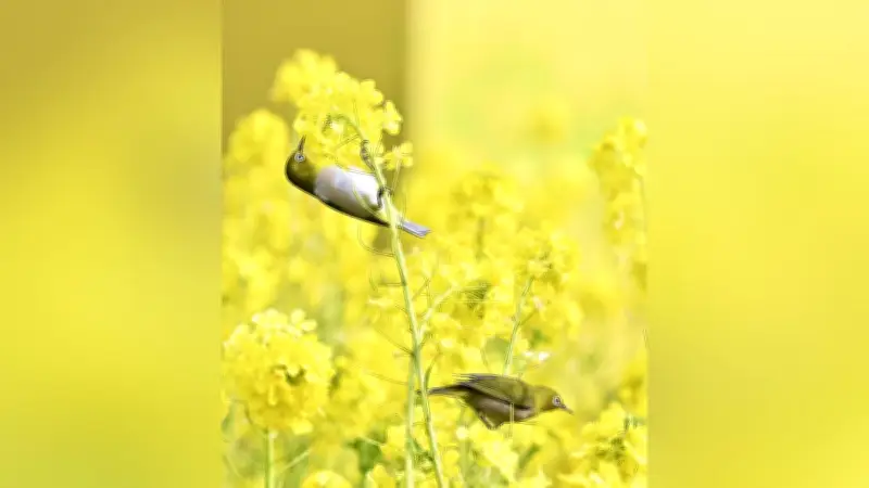 この菜の花畑では、小さな野鳥であるメジロが花をついばむ様子が見られることで知られています。メジロは菜の花の蜜や花粉を求めて飛来し、その愛らしい姿が訪れる人々の目を楽しませています。この光景は、自然と生き物の調和を感じさせる春の風物詩として親しまれています。