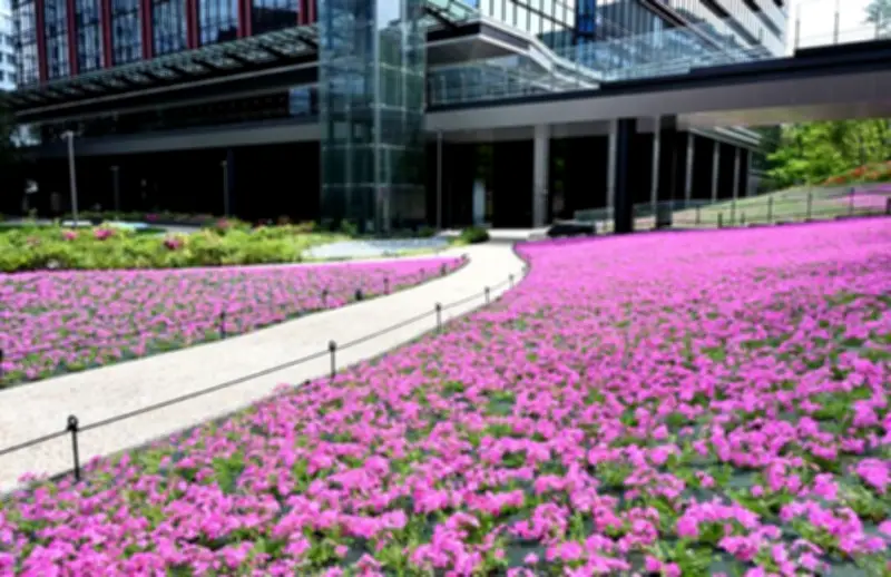 東京都港区のオフィス街で、シバザクラが鮮やかな桜色の花を咲かせ、訪れる人々の目を楽しませています。地下鉄三田駅近くの「住友不動産東京三田ガーデンタワー」の広場では、地面一面にピンク色のじゅうたんが広がったかのような光景が広がっています。