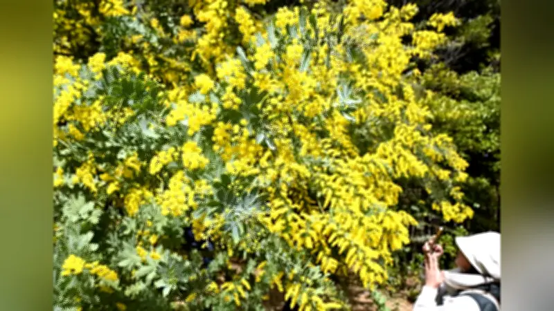 ミモザはマメ科の樹木で、春先に黄色い花を咲かせることで知られる。花はふわふわとした質感で、甘く優しい香りを放つ。この季節の風物詩として、地域の観光スポットにもなっている。家族連れやカップルが訪れ、春の息吹を感じながら散策を楽しんでいる。
