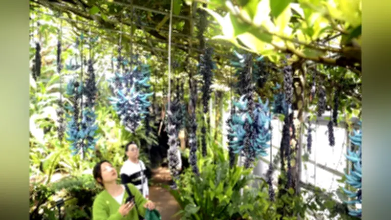 ヒスイカズラはフィリピン原産のマメ科の植物で、同館では約30年前から1本のつるを栽培しています。毎年この時期になると、長さ約50~60センチ、直径約20センチの房状の花が藤のように上から垂れ下がって咲き、頭上から約200個の房が垂れ下がった「トンネル」を形成します。このユニークな景観は、多くの来場者が写真撮影を楽しむ人気スポットとなっています。
