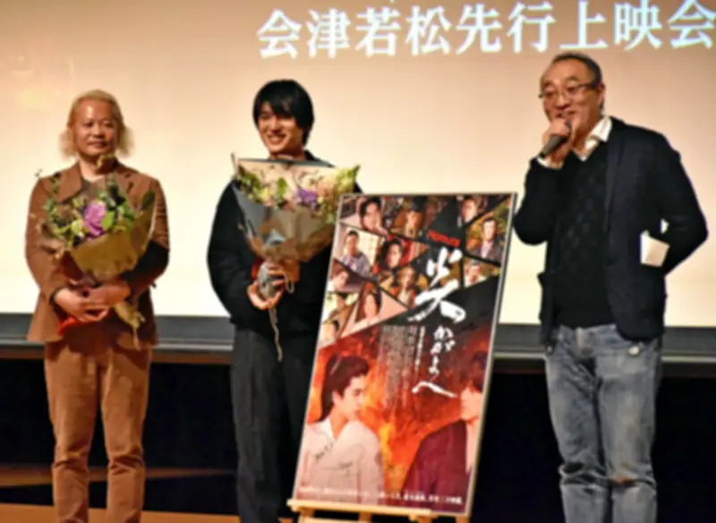 会津若松市を中心に撮影された映画「炎(ほむら)かがよへ」の先行上映会が28日、同市文化センターで開催されました。上映後には、主演を務めた俳優の荒木飛翔(とわ)さんと松田圭太監督が舞台あいさつに立ち、ロケ地での貴重なエピソードや作品への熱い思いを明かしました。