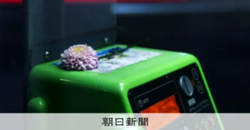 2026年2月21日夜、東京・千代田区神保町の大通り沿いにある公衆電話ボックスに、観光客らがスマートフォンを向けていました。中を覗くと、見慣れた緑色の公衆電話の上に、一輪のうすピンク色のガーベラの花が丁寧に置かれていたのです。