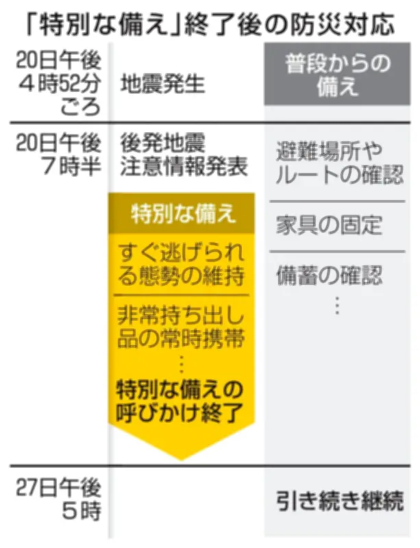 青森県で震度5強を観測した三陸沖の地震から、27日で1週間が経過した。2回目の発表となった「北海道・三陸沖後発地震注意情報」に基づく「特別な備え」の呼びかけは、規模の大きな地震が発生しなければ午後5時で終了する。しかし、巨大地震発生の危険性は依然として存在しており、避難場所の確認や非常用品の備蓄といった日常的な備えを通じた心構えは、今後も必要とされている。