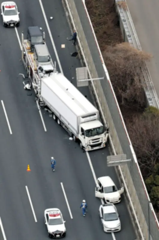 県警高速隊の発表によると、事故はキャリアカーが前方を走行していた大型トラックに追突したことに端を発しました。その衝撃でキャリアカーが弾み、さらに前を走っていた別のトラックと普通乗用車を巻き込む形で玉突き事故に発展したとみられています。