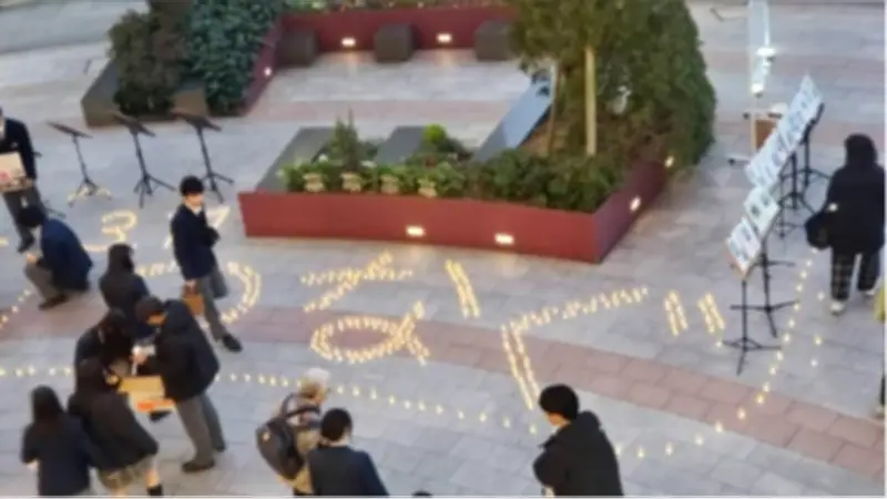 ツアー後の3月11日には、京王線・聖蹟桜ヶ丘駅前の広場で、「3.11 つなぐ」と光るキャンドルナイトを開催しました。このイベントでは、震災の犠牲者を追悼するとともに、支援の輪を広げるために街頭募金も行われました。キャンドルの灯りは、地域住民や通行人に平和と希望のメッセージを伝え、震災の記憶を未来へとつなぐ役割を果たしました。