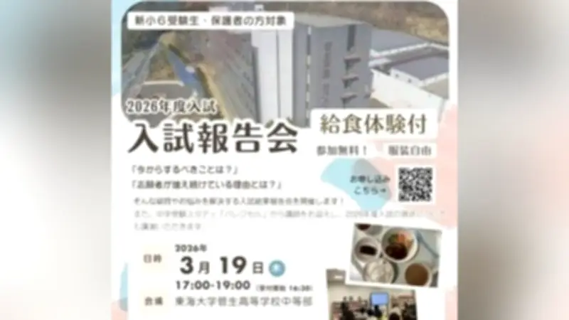 東海大学菅生高等学校中等部(東京都あきる野市)は、2026年3月19日に中等部の入試報告会を実施します。このイベントでは、2月に行われた中等部入試の結果報告や、出題された問題の詳細な解説が予定されています。