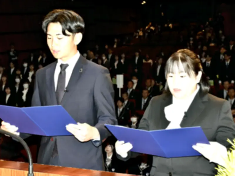 式典では、東日本国際大学健康福祉学部の平沢亮河さんといわき短期大学子ども未来科の森谷さんが、新入生を代表して宣誓を行いました。二人は緊張しながらも、これからの学びと将来への希望を込めて誓いの言葉を述べました。