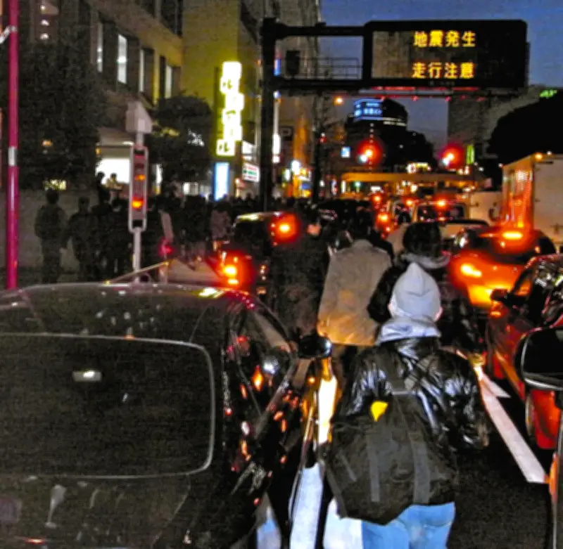 道中、長柴さんはハイヒールを手に持ちスリッパで歩く女性や、革靴のかかとを踏みつぶして歩く男性の姿を目にした。これらは都内から歩いてきた帰宅困難者たちだった。東日本大震災後には帰宅困難者が街にあふれ、渋滞した車列の間を縫うように進む歩行者の光景が各地で見られた。