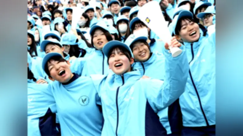 選抜高校野球4日目の3月22日、甲子園球場のアルプス席で、山梨学院高校のソフトボール部員17人が、野球部の試合を熱心に応援する姿が見られた。部員たちは学校カラーのブルーを基調としたジャケットを羽織り、メガホンを手に声援を送り、球場を盛り上げた。
