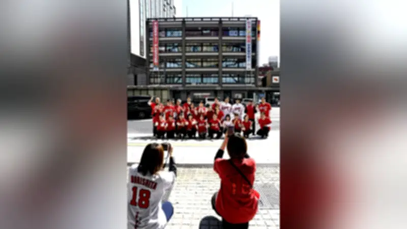 作業は約1時間半で完了し、終了後には行員たちが電車通りで、完成した装飾をバックに記念写真を撮影しました。営業統括部の新堀由依さん(29歳)は、末包昇大選手のユニホームを着て参加し、「同い年なので末包選手を応援しています。みんなで協力して迫力ある装飾ができました」と笑顔で語りました。