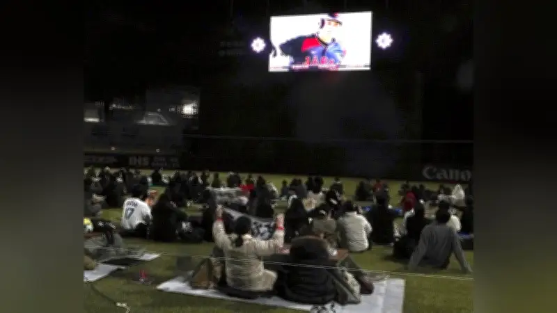 2026年3月6日、東京都稲城市のジャイアンツタウンスタジアム(通称Gタウン)で、ワールド・ベースボール・クラシック(WBC)の日本代表「侍ジャパン」の台湾戦を応援するパブリックビューイング(PV)が開催されました。このイベントには約1000人のファンが集結し、バックスクリーンの大型ビジョンで試合を観戦しながら、歓声を上げて盛り上がりました。