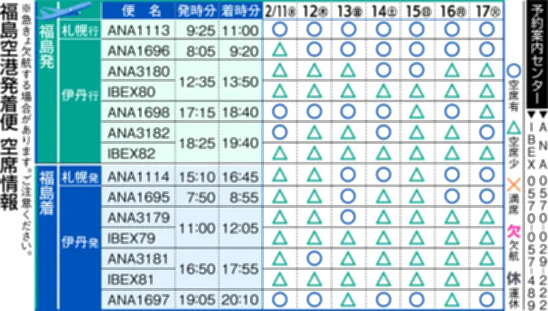 - 福島空港発着便 空席情報 2月5日現在(2026年2月5日12時58分)